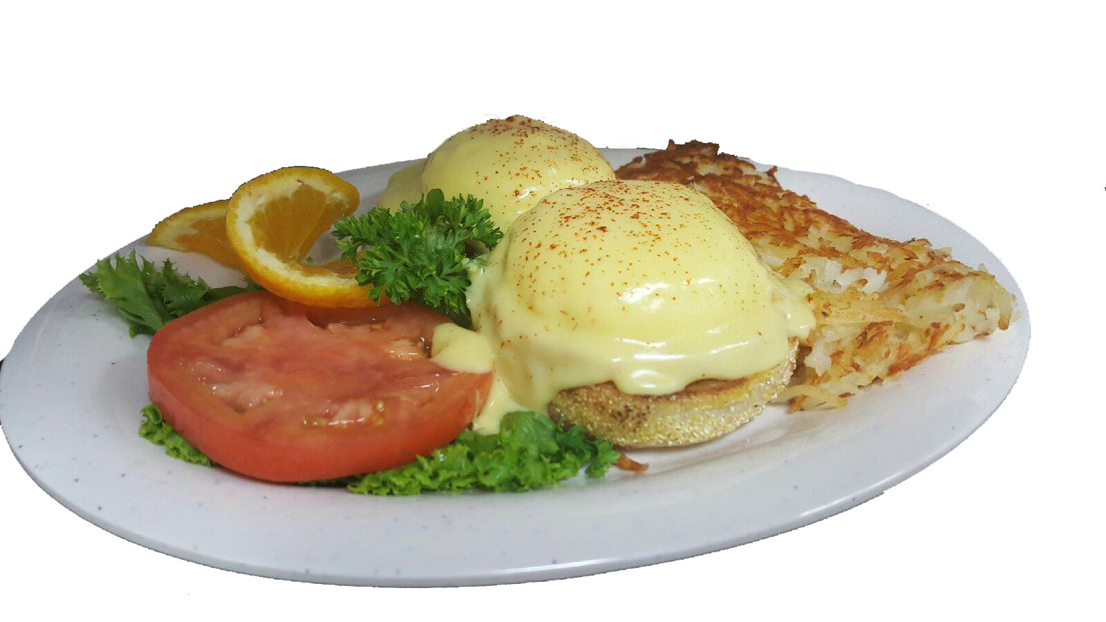 Homemade Specials Two Poached Eggs & Canadian Style Bacon on An English Muffin with Home Style Hollandaise Sauce. Choice of Hash Browns, Toast or Rice.